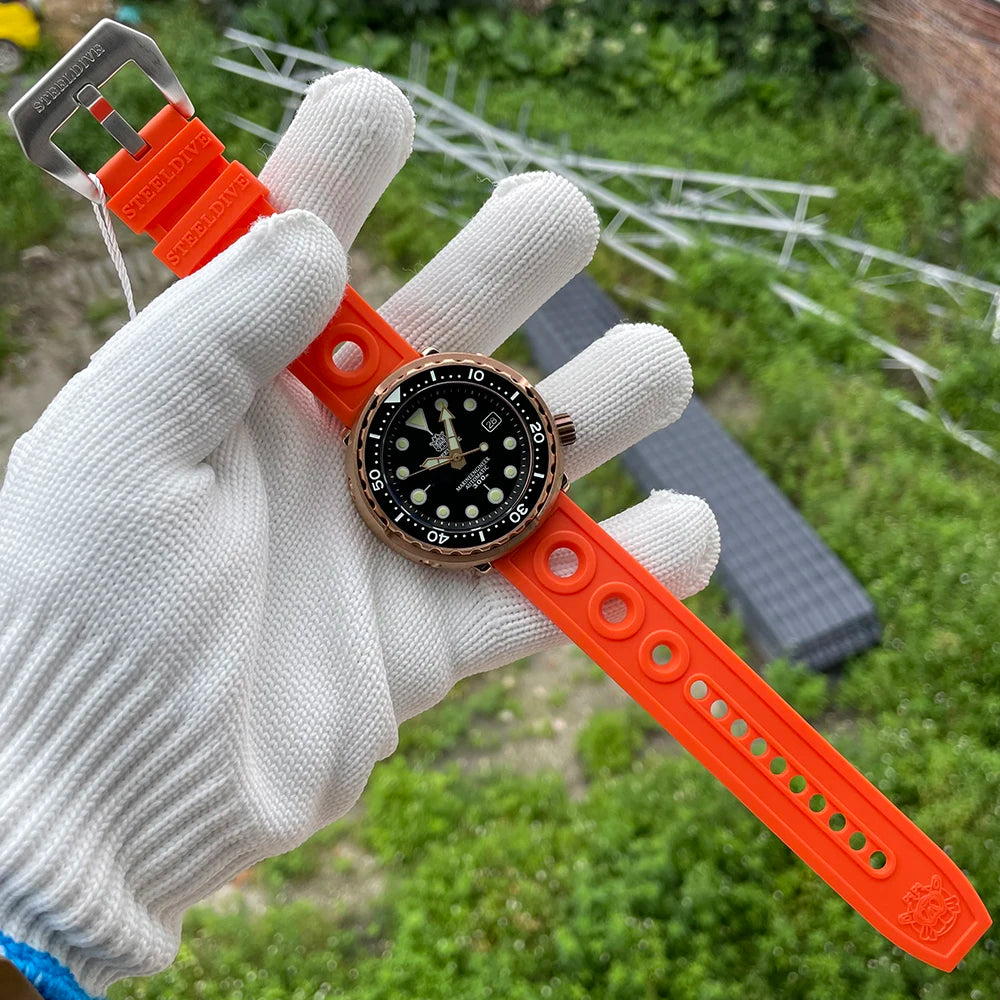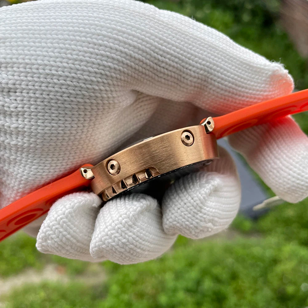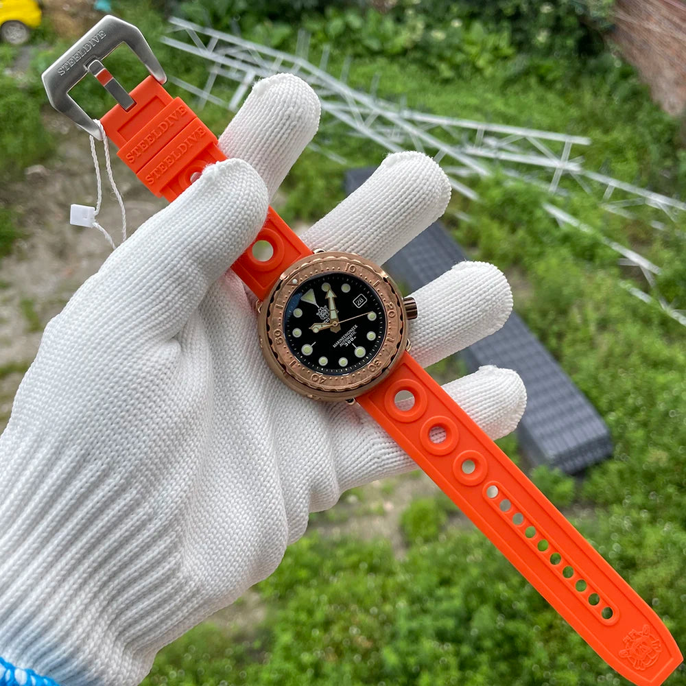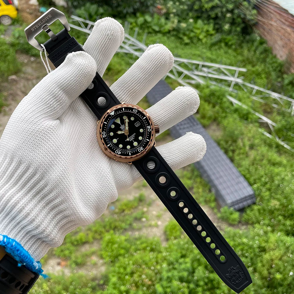 Designed for modern men, this dive watch combines elegance and functionality. The rubber strap and bronze casing are durable and add a modern touch. The waterproof feature makes it a practical accessory and being luminous it is easily readable in low-light conditions. Wear it with your favorite outfit to give your outfit that extra bit of flair.