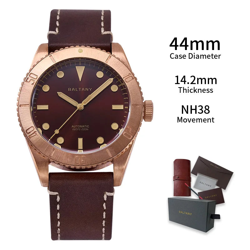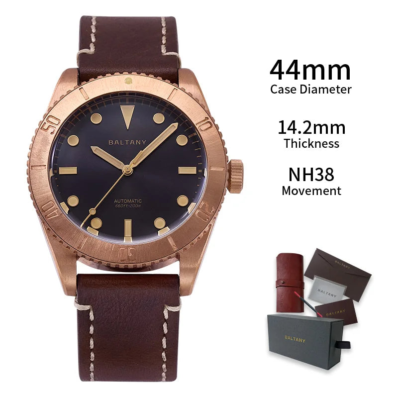 Men's Bronze 44mm 200M Waterproof NH38 Automatic Mechanical Military Watch