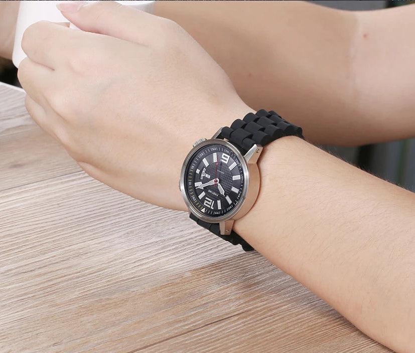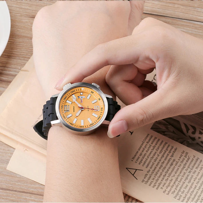 Perfect for the modern men, this aesthetic and classy watch exudes sophistication and timeless appeal. Designed with a silicone strap and stainless steel dial, offering both durability and style, this watch is a great option for both formal and casual wear. The luminous hands, waterproof construction and the day & date display are great. Wear it with your favorite outfit to make yourself look great and stylish.