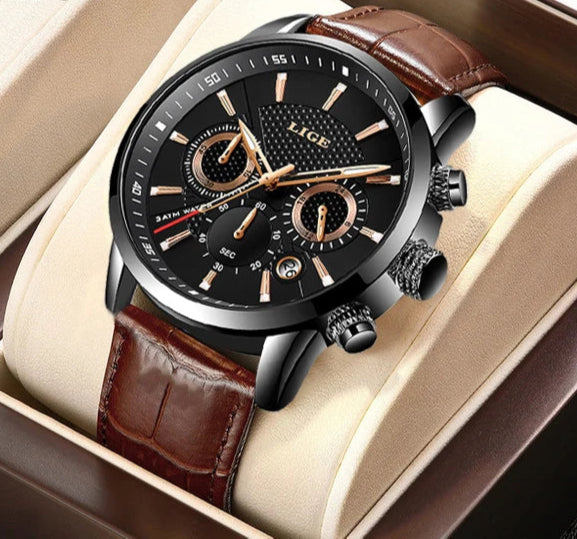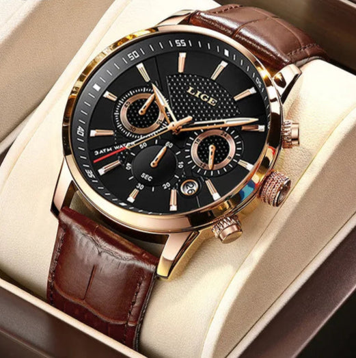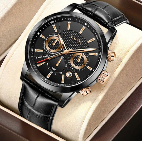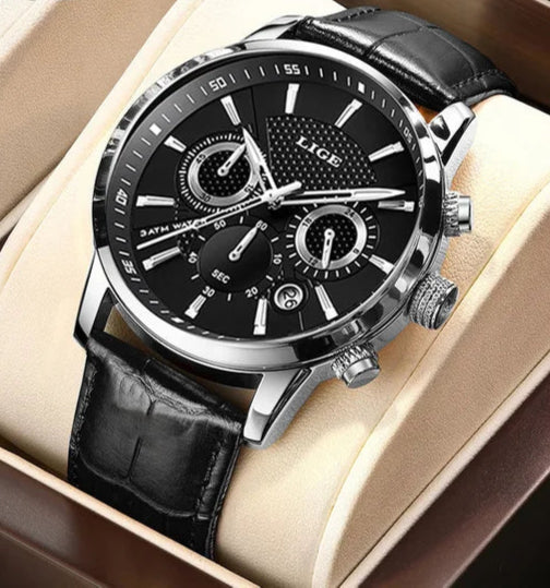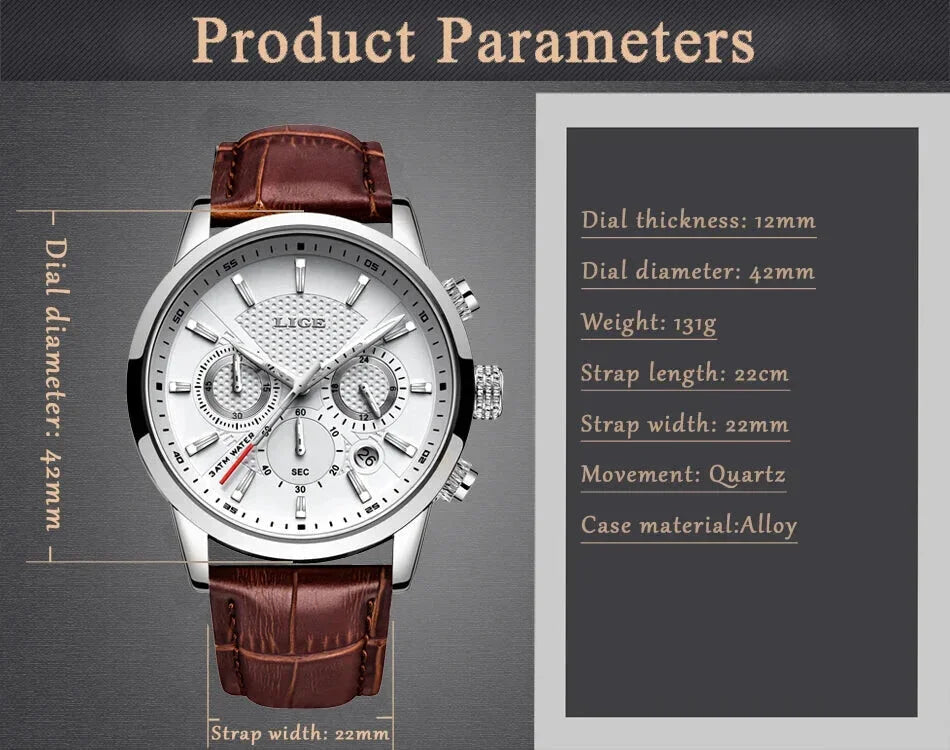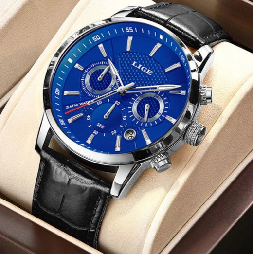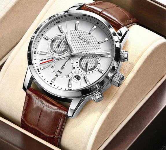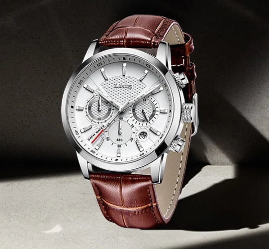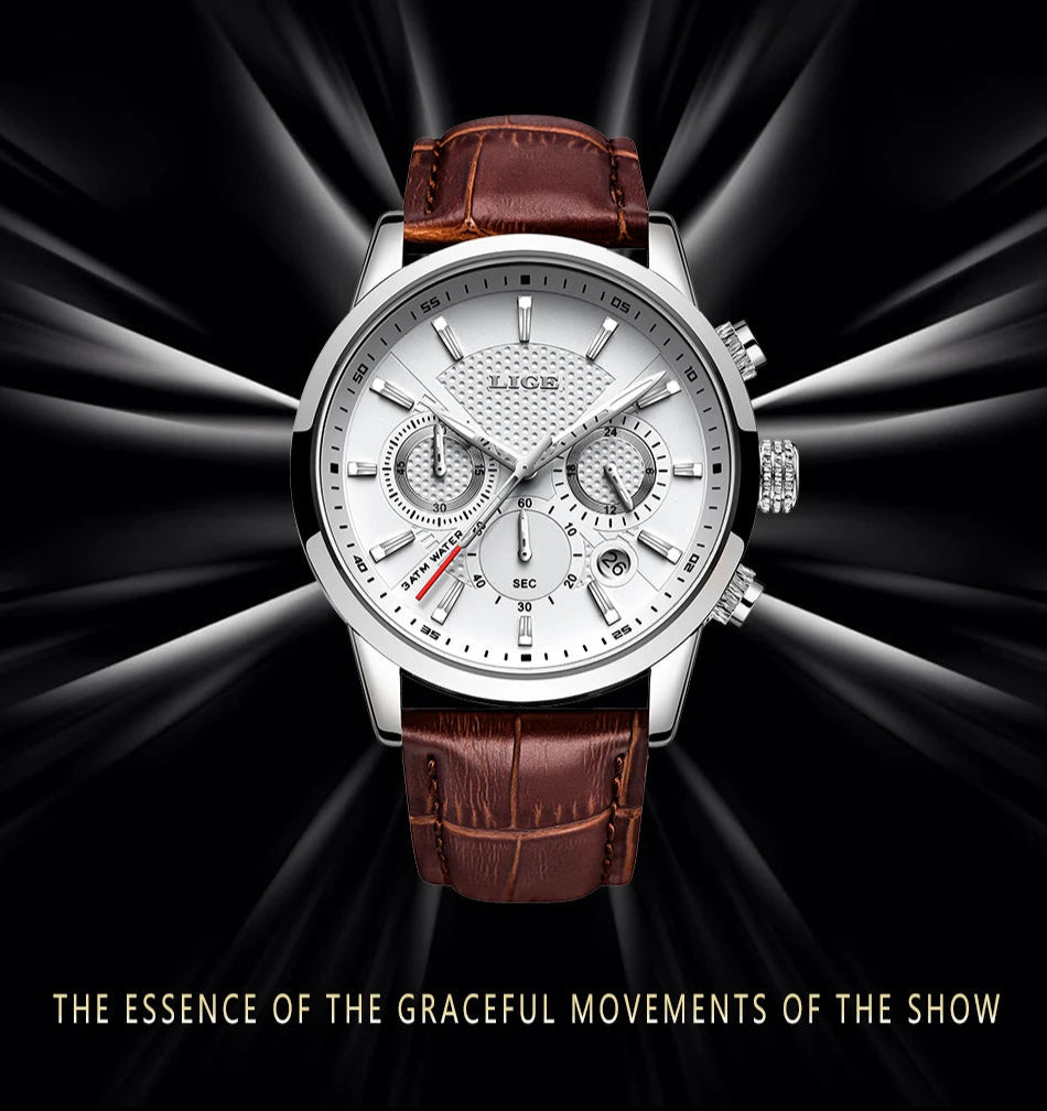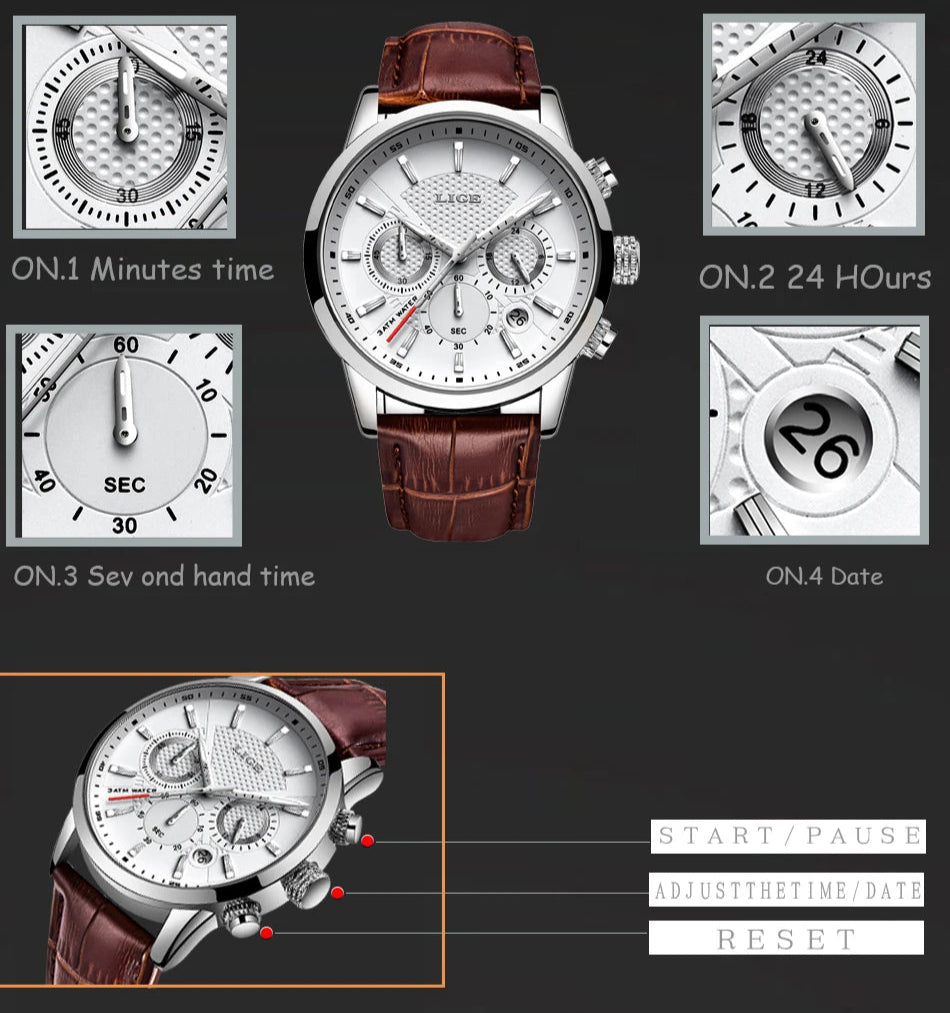 Complementing any outfit effortlessly, this functional watch will make you look more stylish. Available with a leather strap and stainless steel casing, it is a perfect pair for every outfit. It features a stop watch, shock resistance, luminous hands, chronograph and a complete calendar that make it a functional piece. Its versatile design makes it a must-have addition to your watch collection.