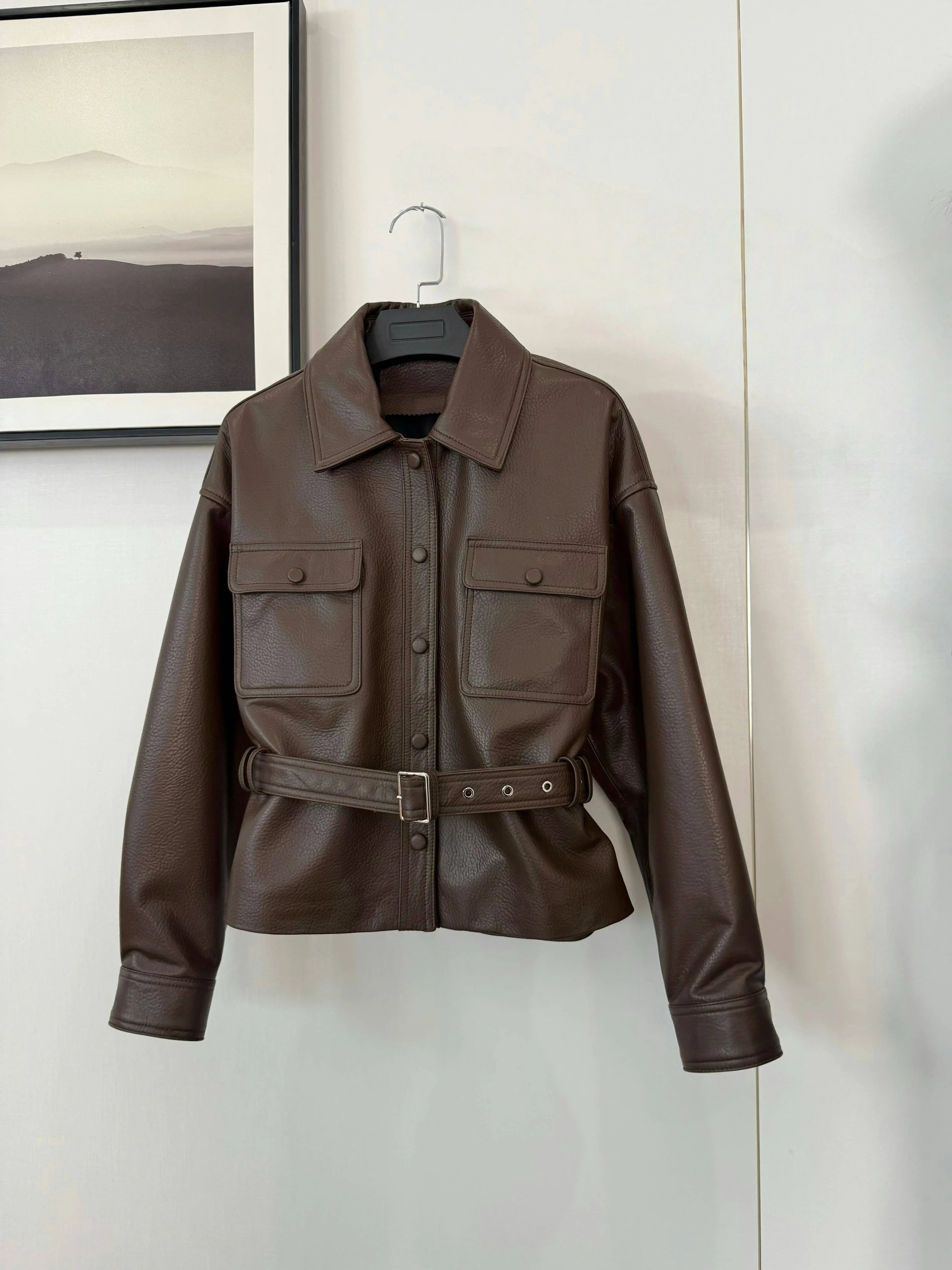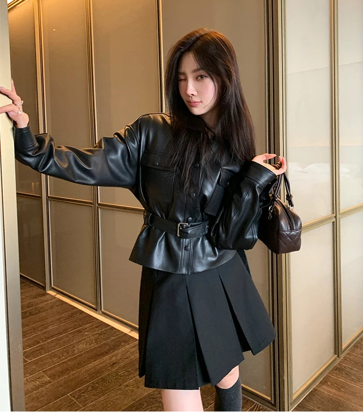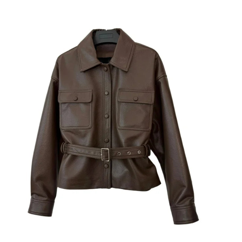 Women's Autumn Winter Fashion Slim Genuine Leather Belted Jacket