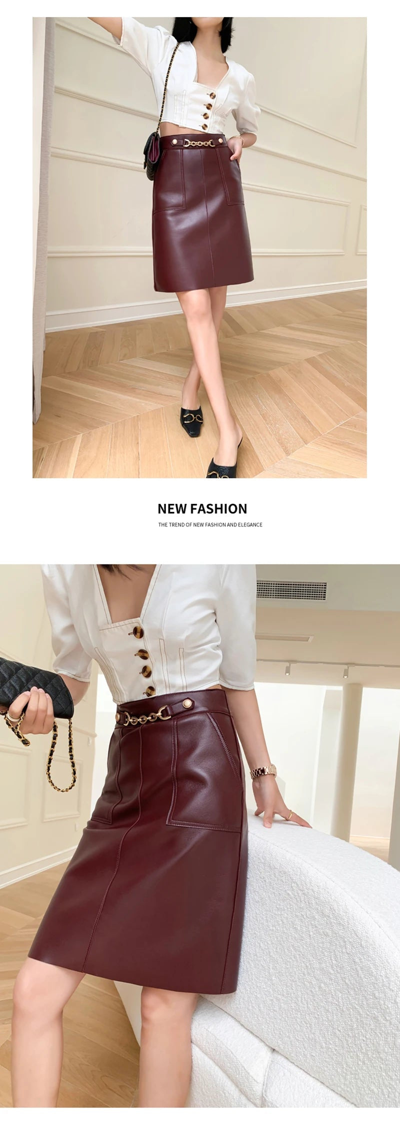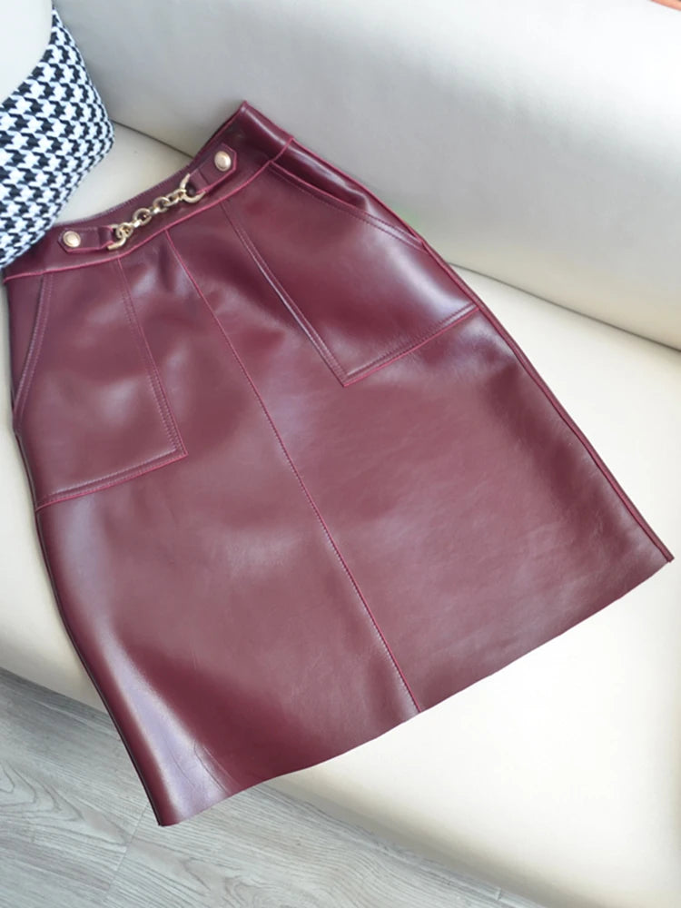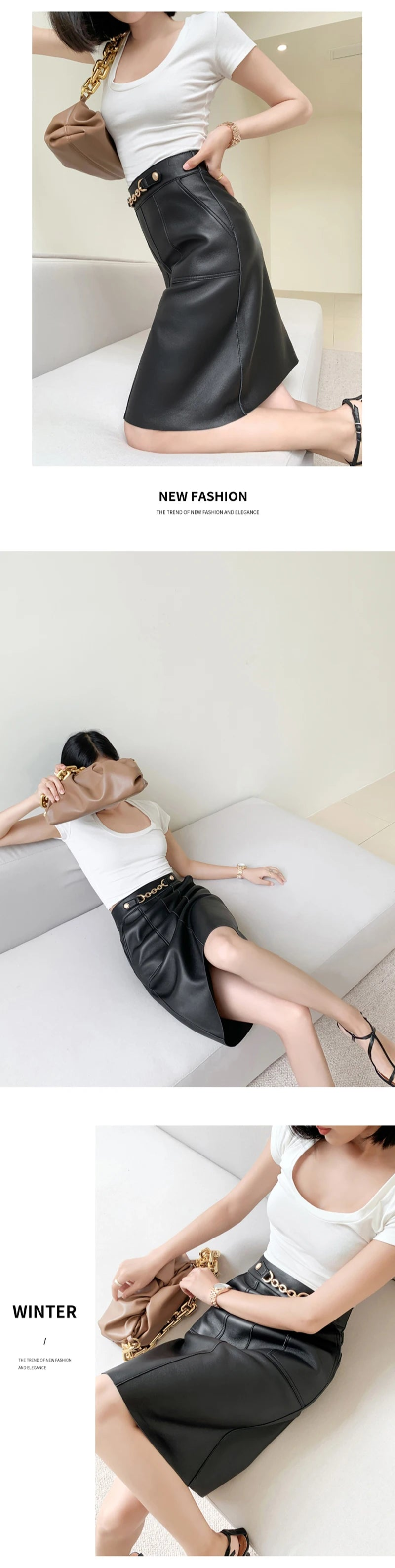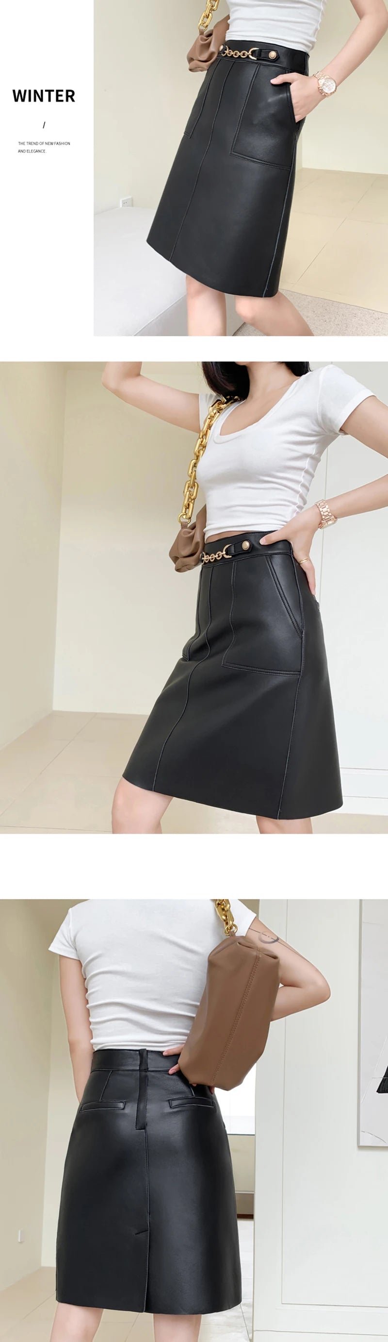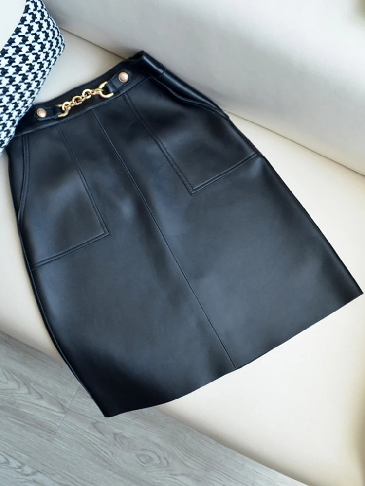 This women's midi A-line skirt is your go-to choice for comfort and style. The sleek design with sheepskin leather makes it comfortable and perfect for everyday wear. The metal chain, high waistline, wrap hip style and the elegant solid color finish give it a simple yet trendy look. Shop now!