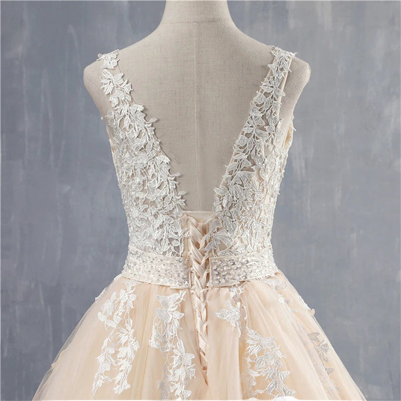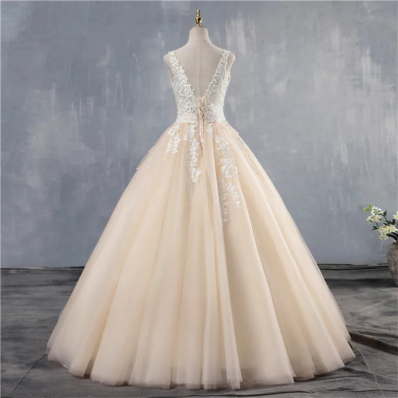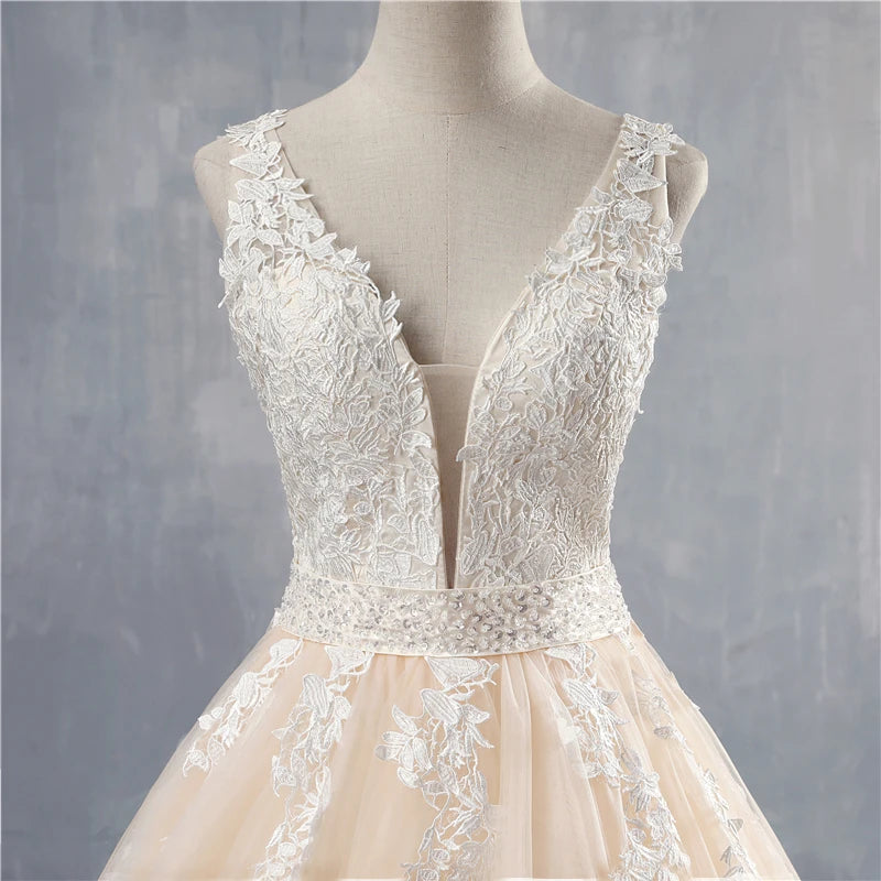 Plus Size Bridal Tulle Deep V Neck Open Back Lace Wedding Dress