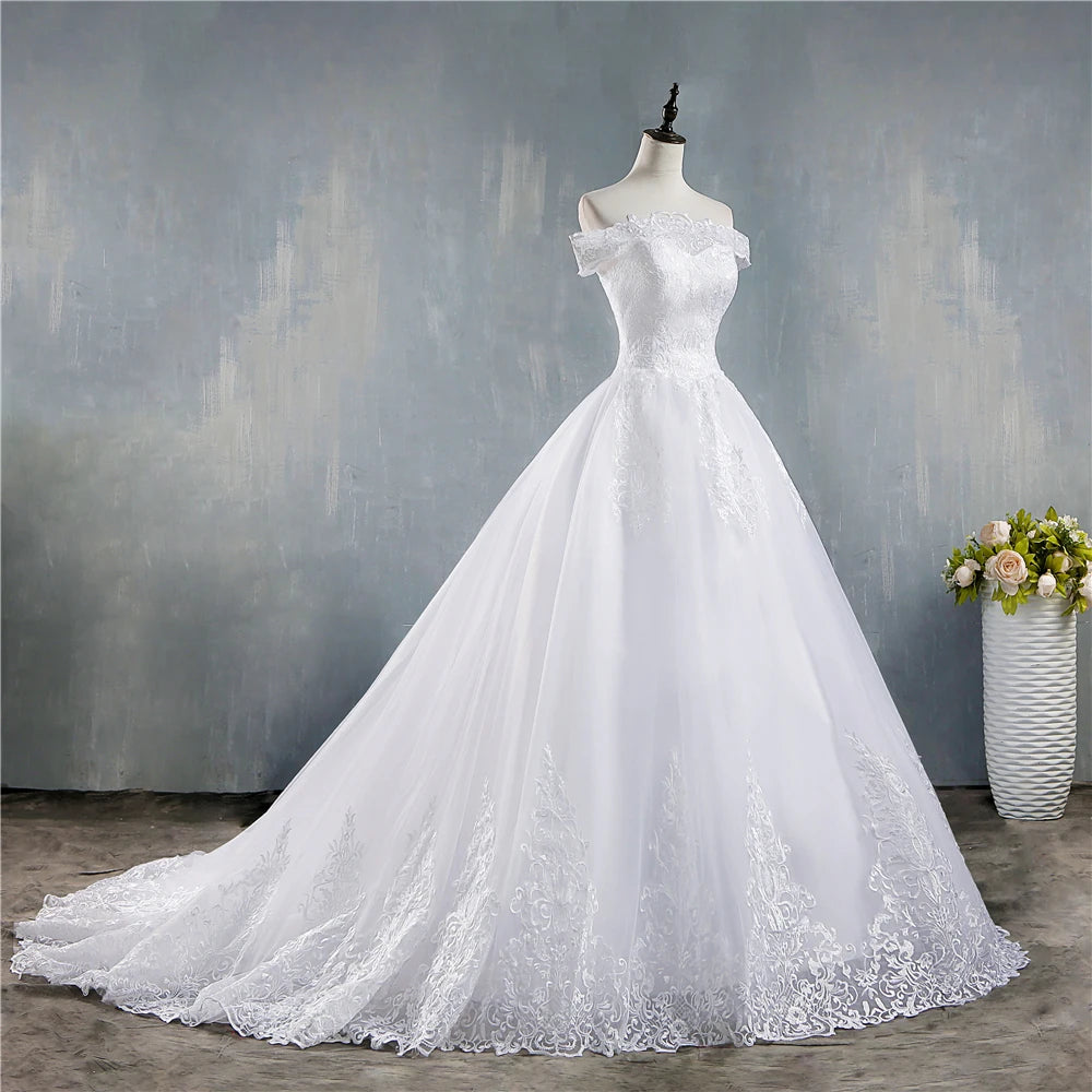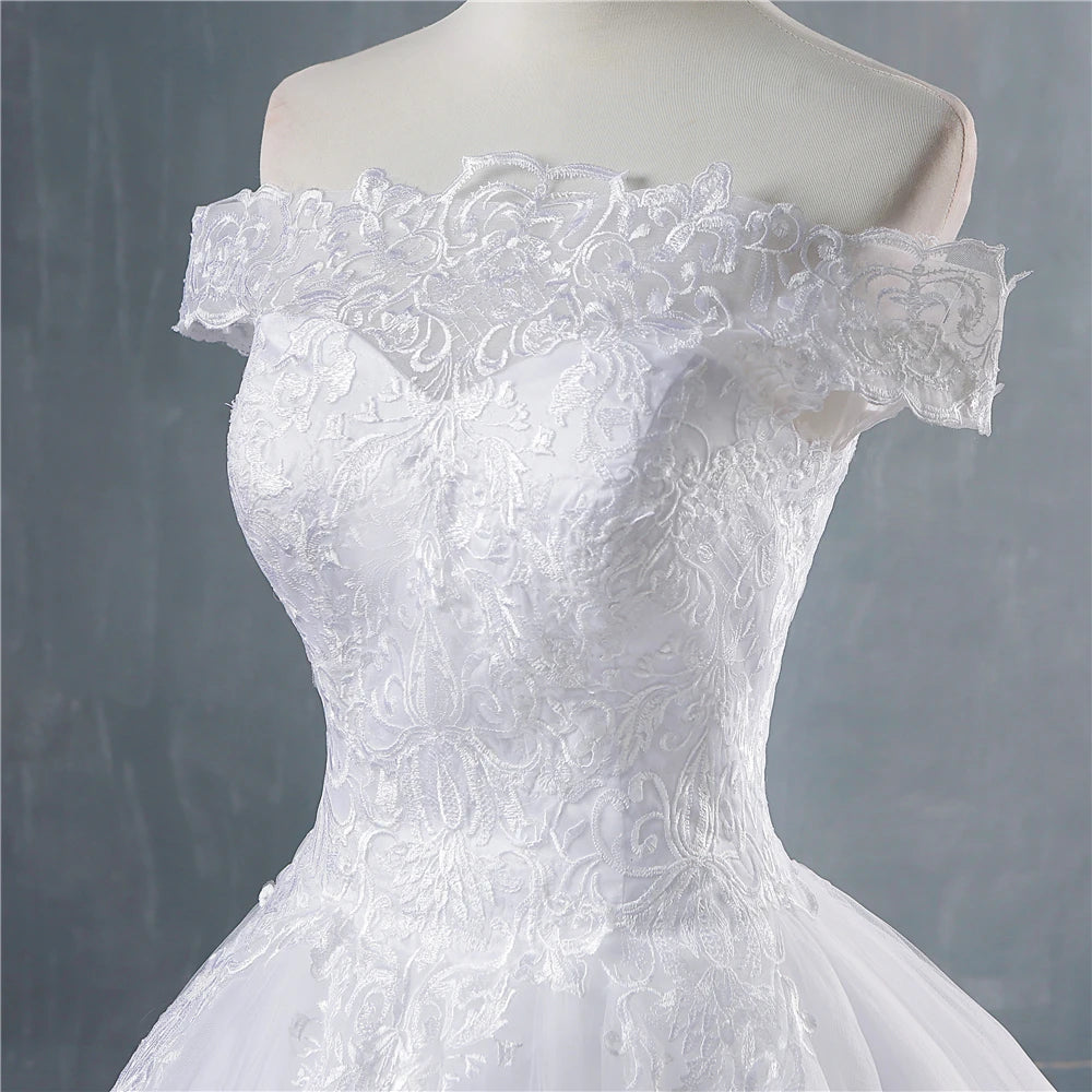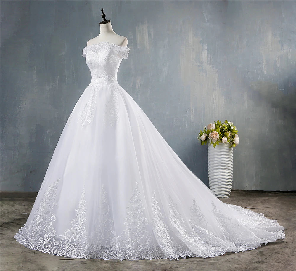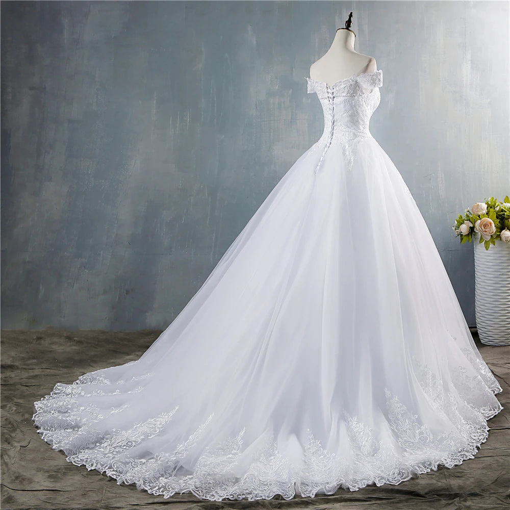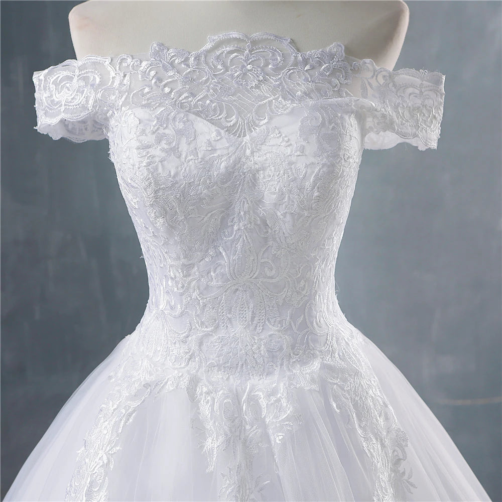 White Ivory Off-the-Shoulder Wedding Dress With and Without Lace Edge Train
