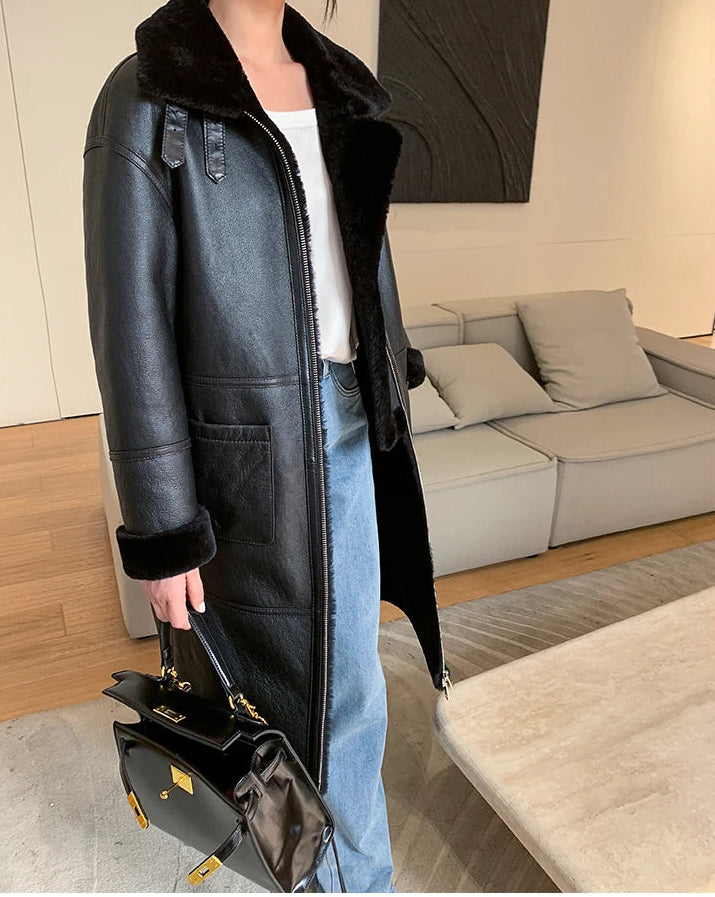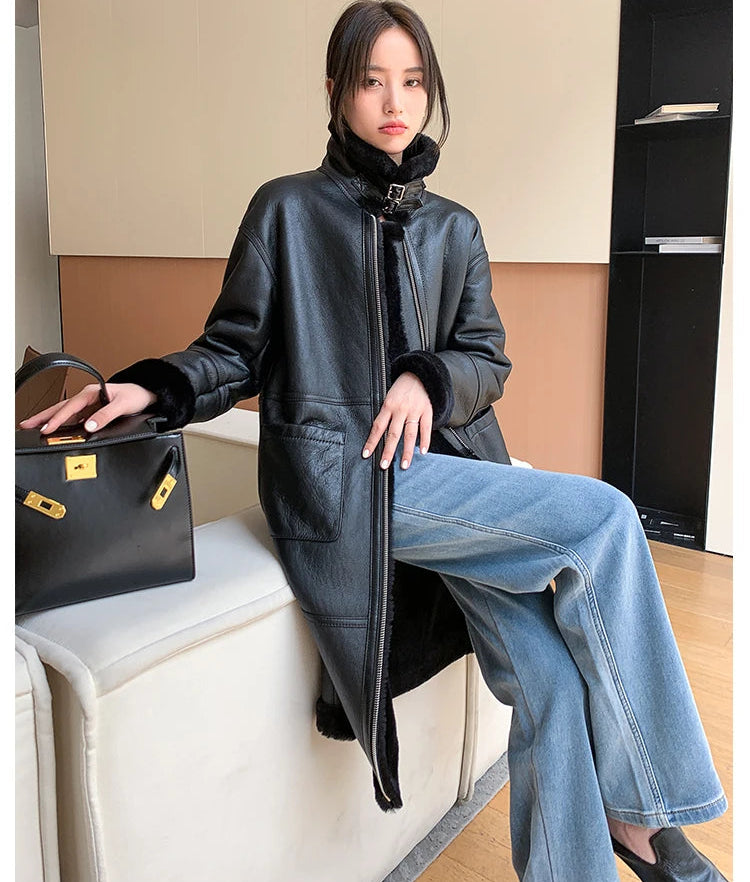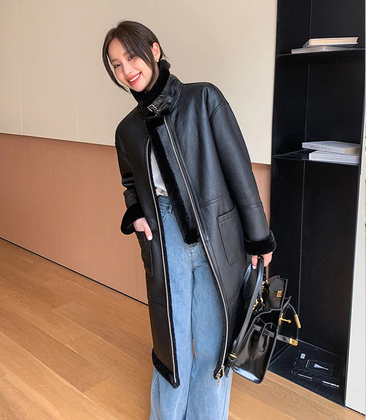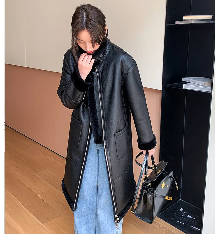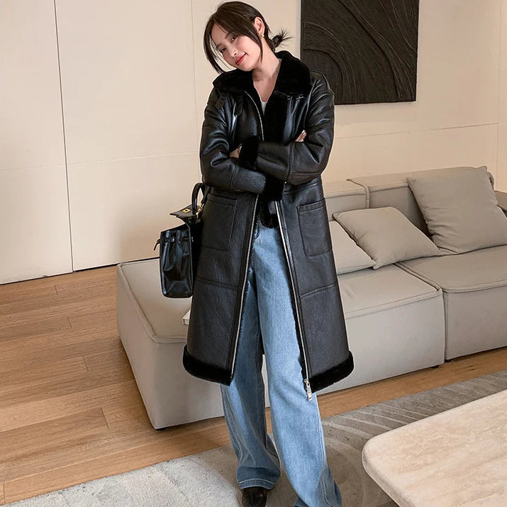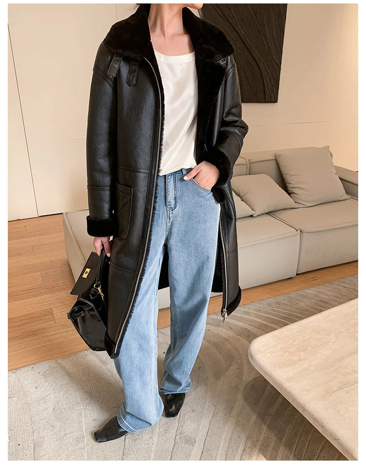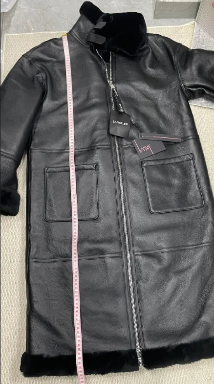 Women's Natural Merino Sheepskin Wool Double-Faced Fur Winter Coat