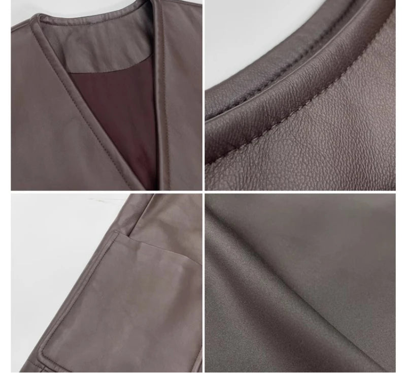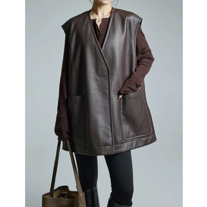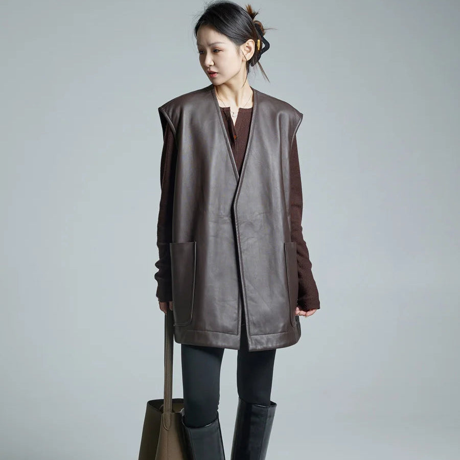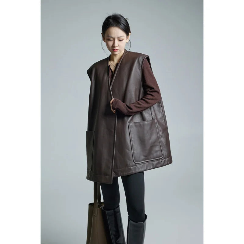 Women's Real Sheepskin Thin Loose Mid-Length Vest with Broad Shoulder