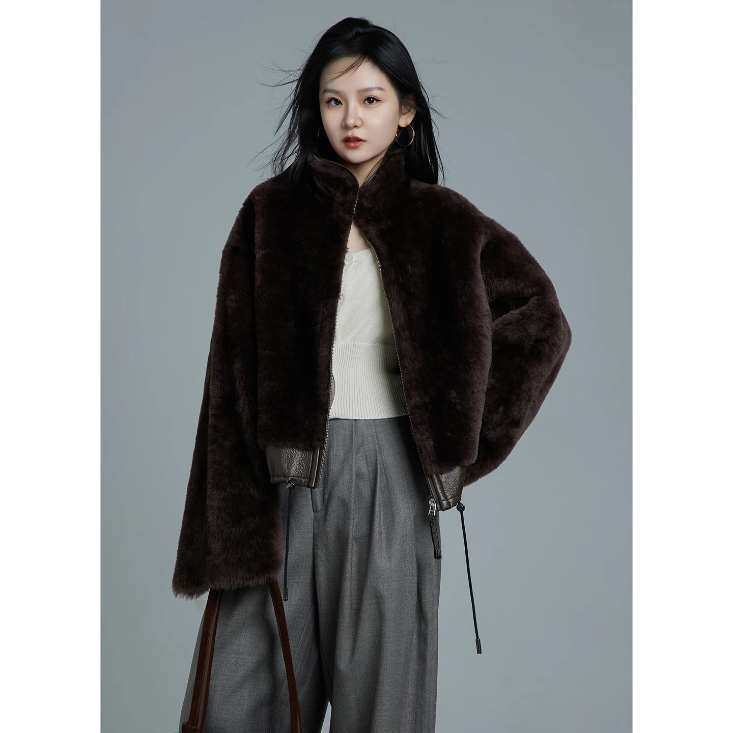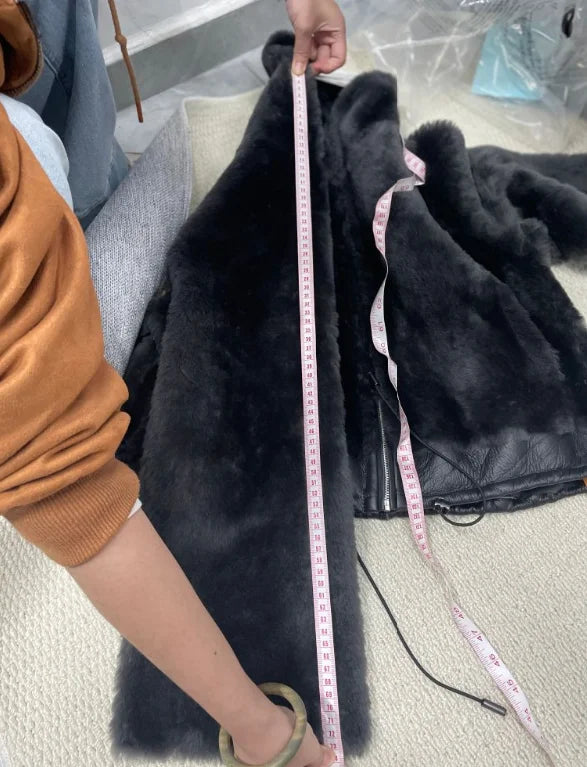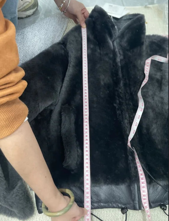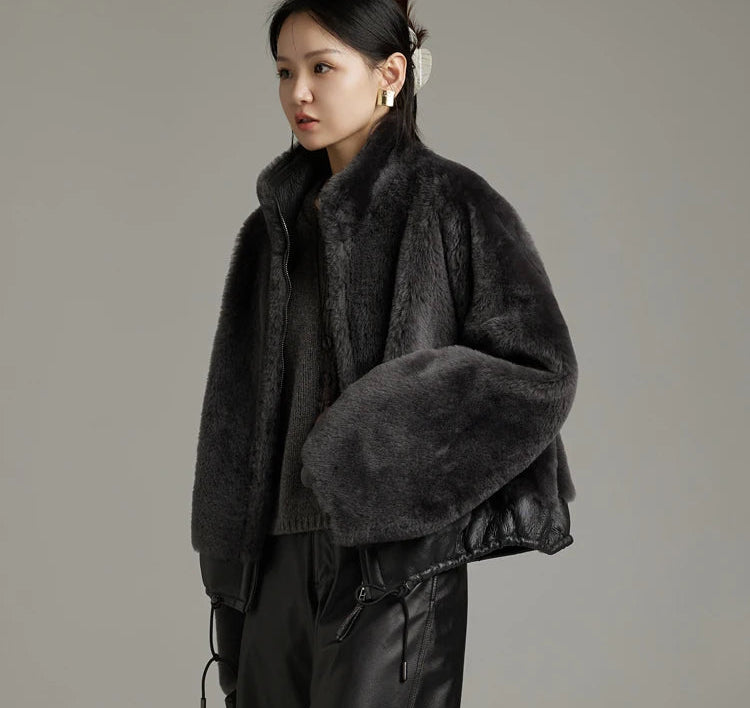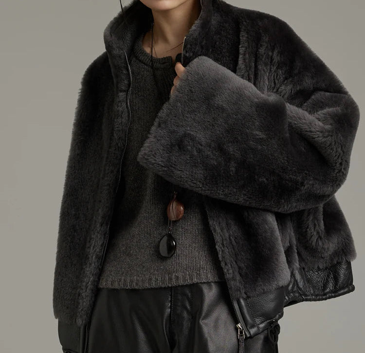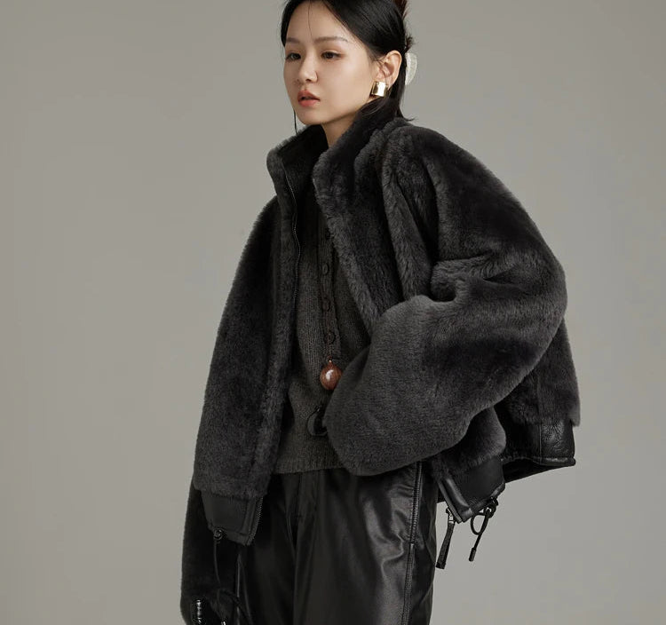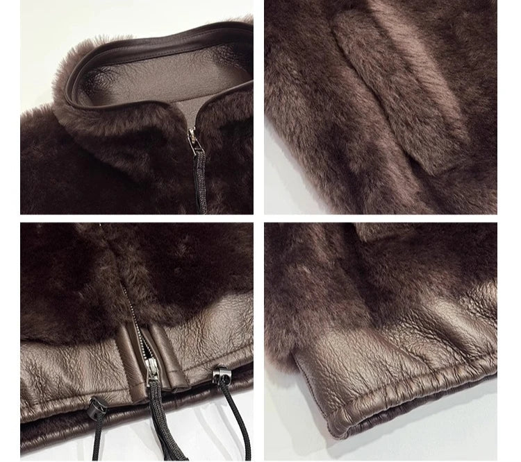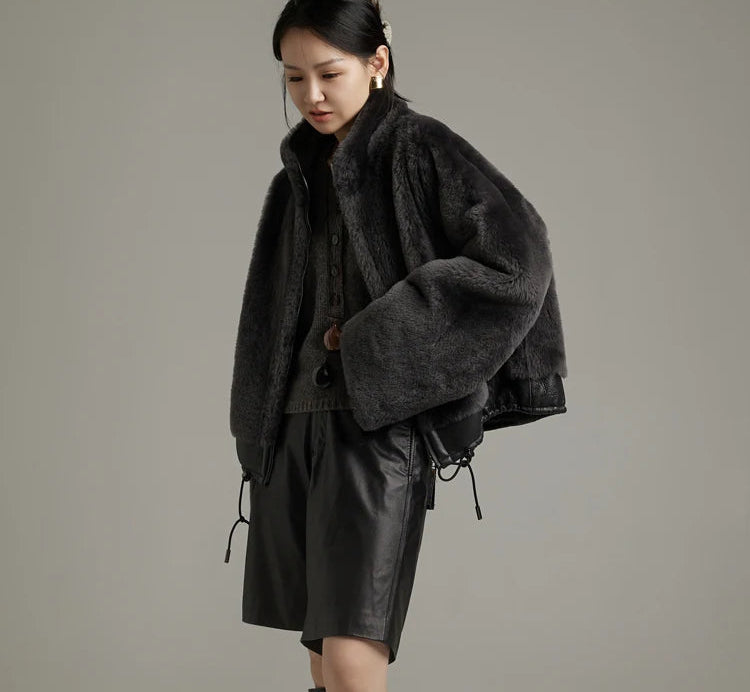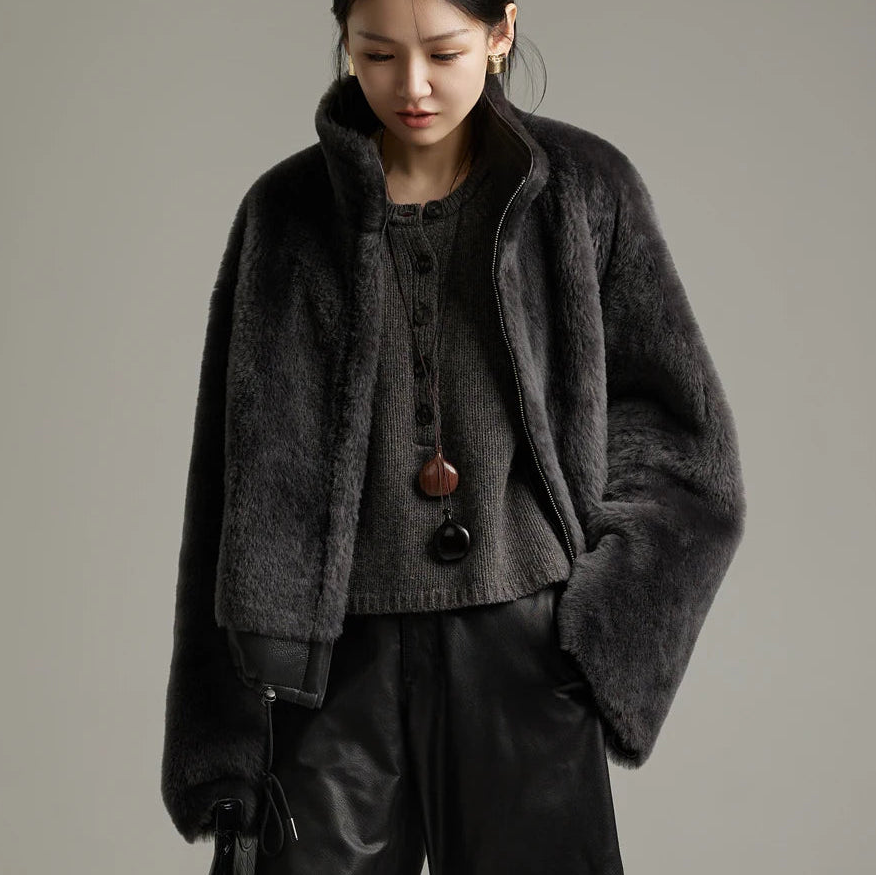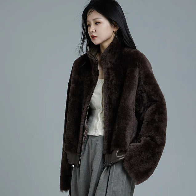 Women's Winter Merino Wool Sheepskin Fur Stand Collar Coat